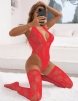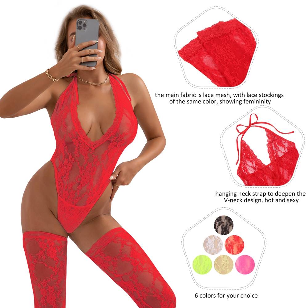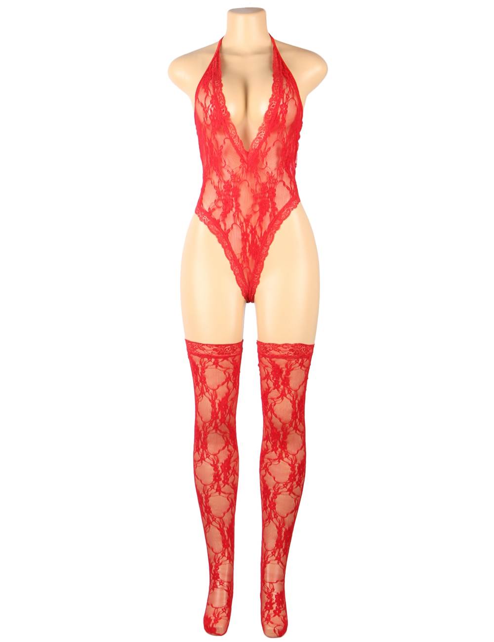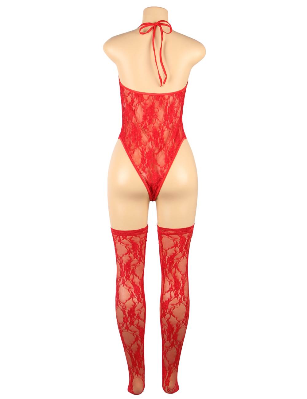 Sexy Halter V Neckline Red Lace Teddy with the Stocking
