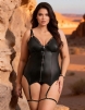 Standard Product Name: Black, V-neck PU leather style, double shoulder strap design for added stability, back button design, adjustable straps, front lace trim, silver metal zipper in the front, smooth and textured, four elastic garters, includes panties, sizes M-3XL plus size, sexy strap leather dress.
