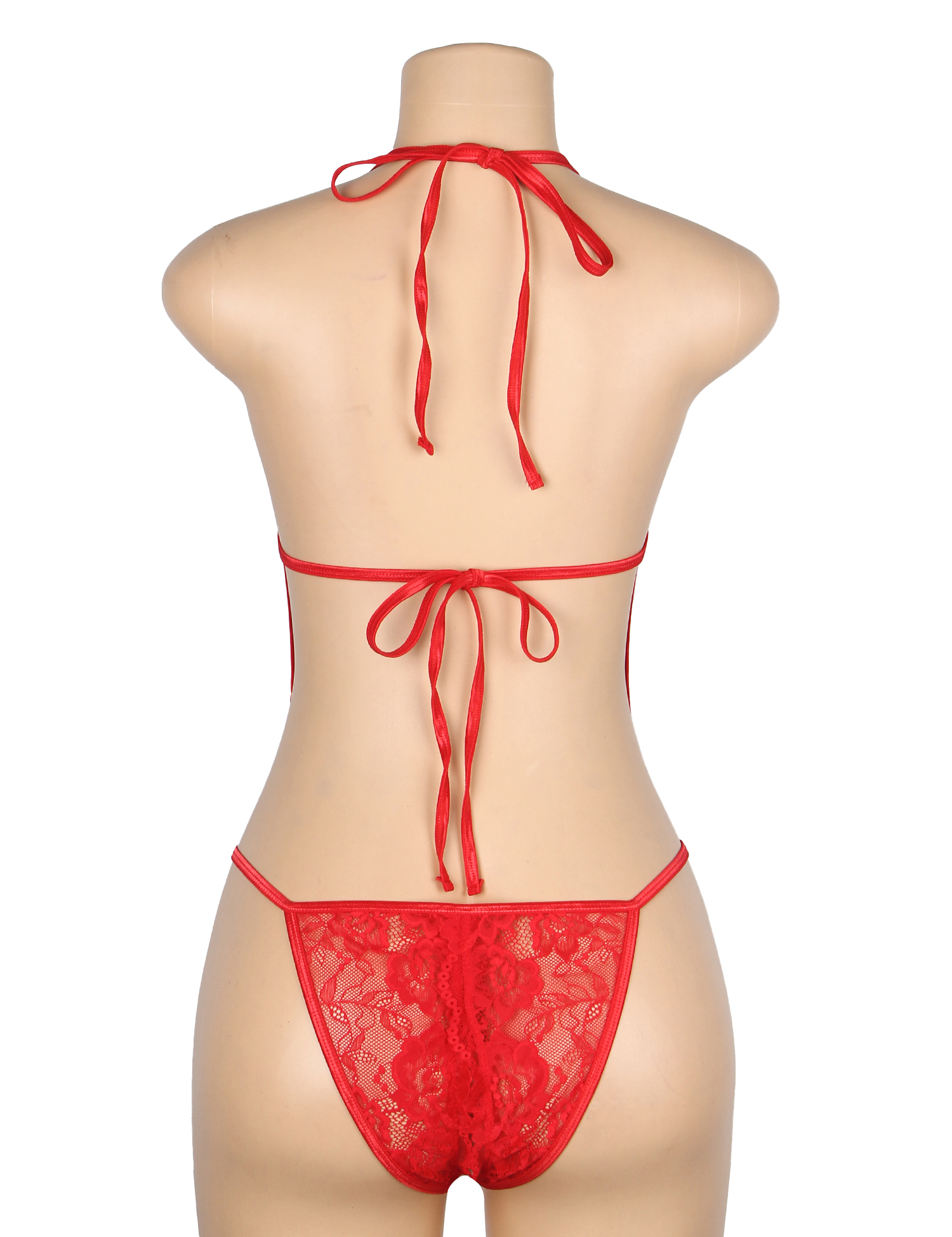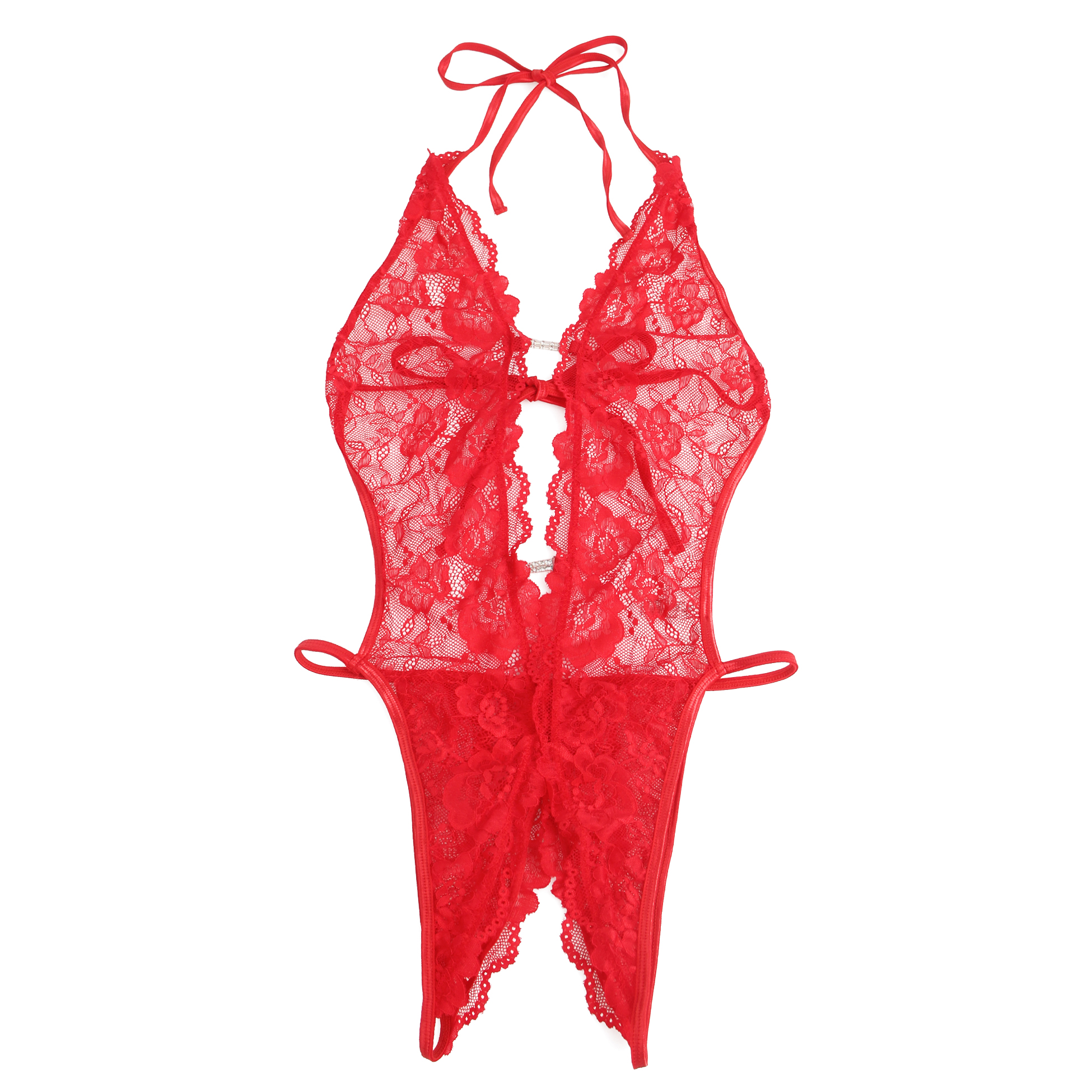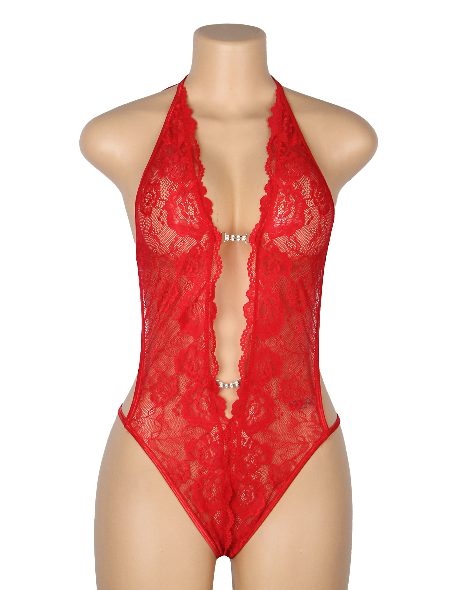 Red Lace Sexy V Neck Halter Backless Open Crotch Teddy Lingerie