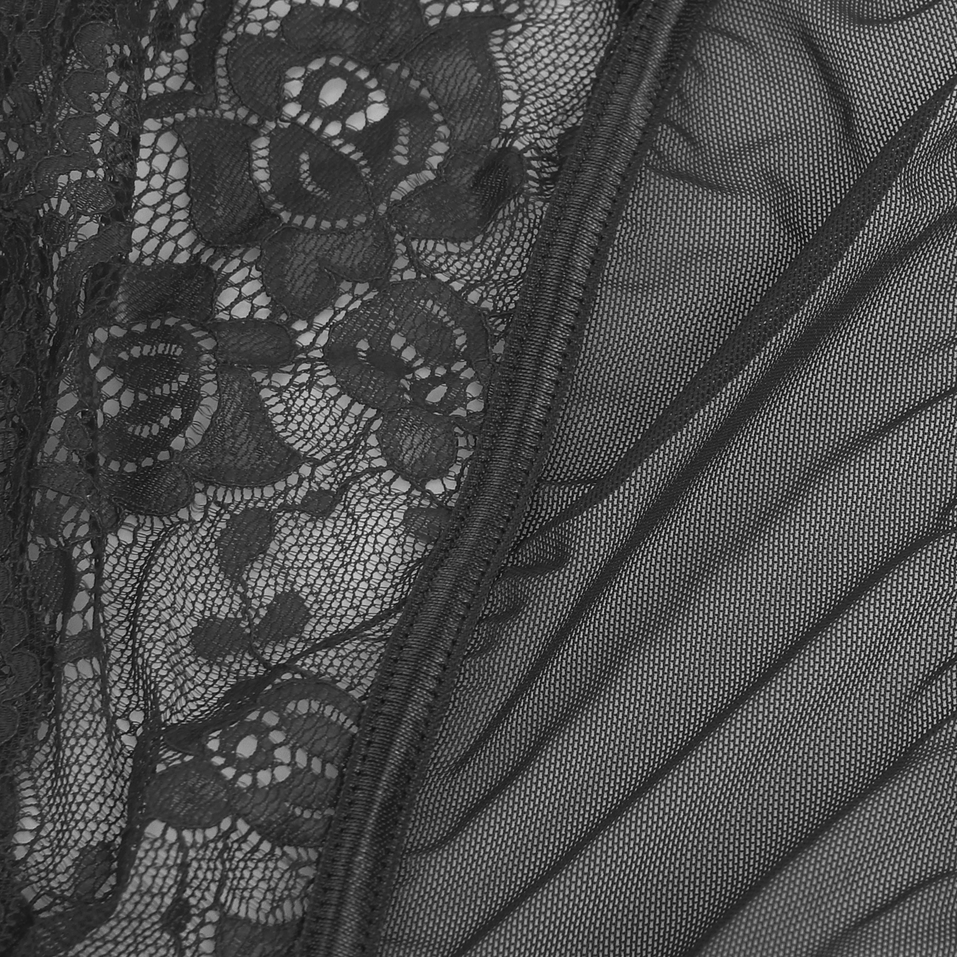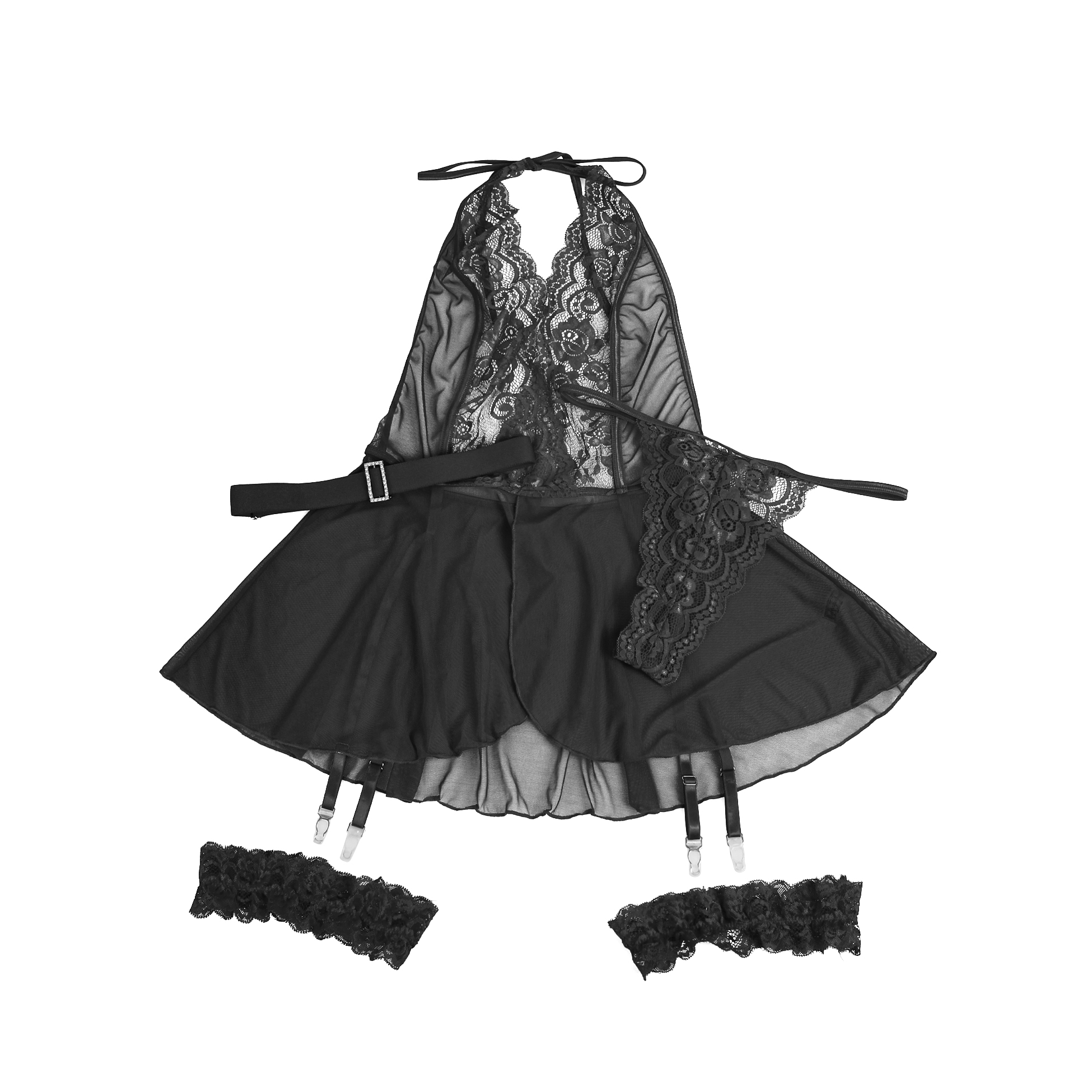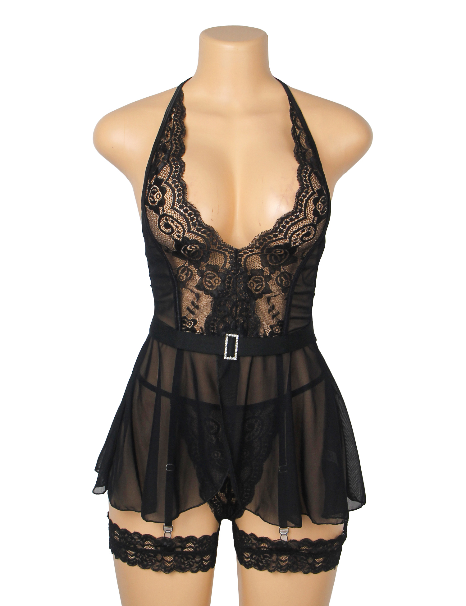 Black Sexy See Through Lace Mesh Deep V Halter Neck Backless Garter Lingerie Set